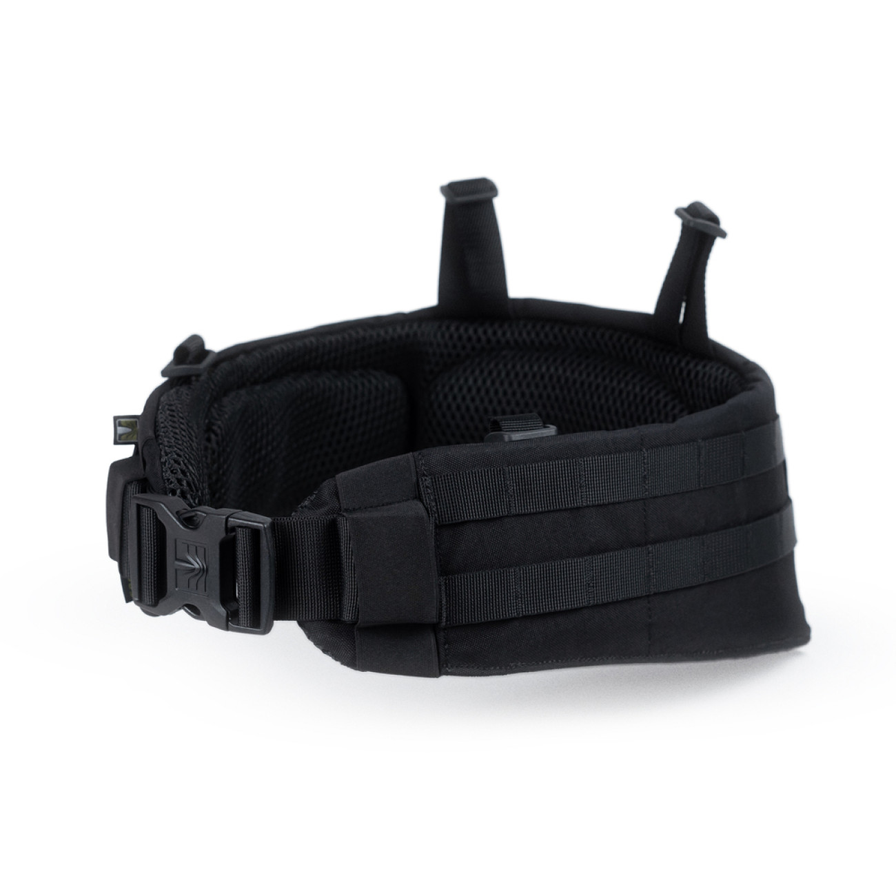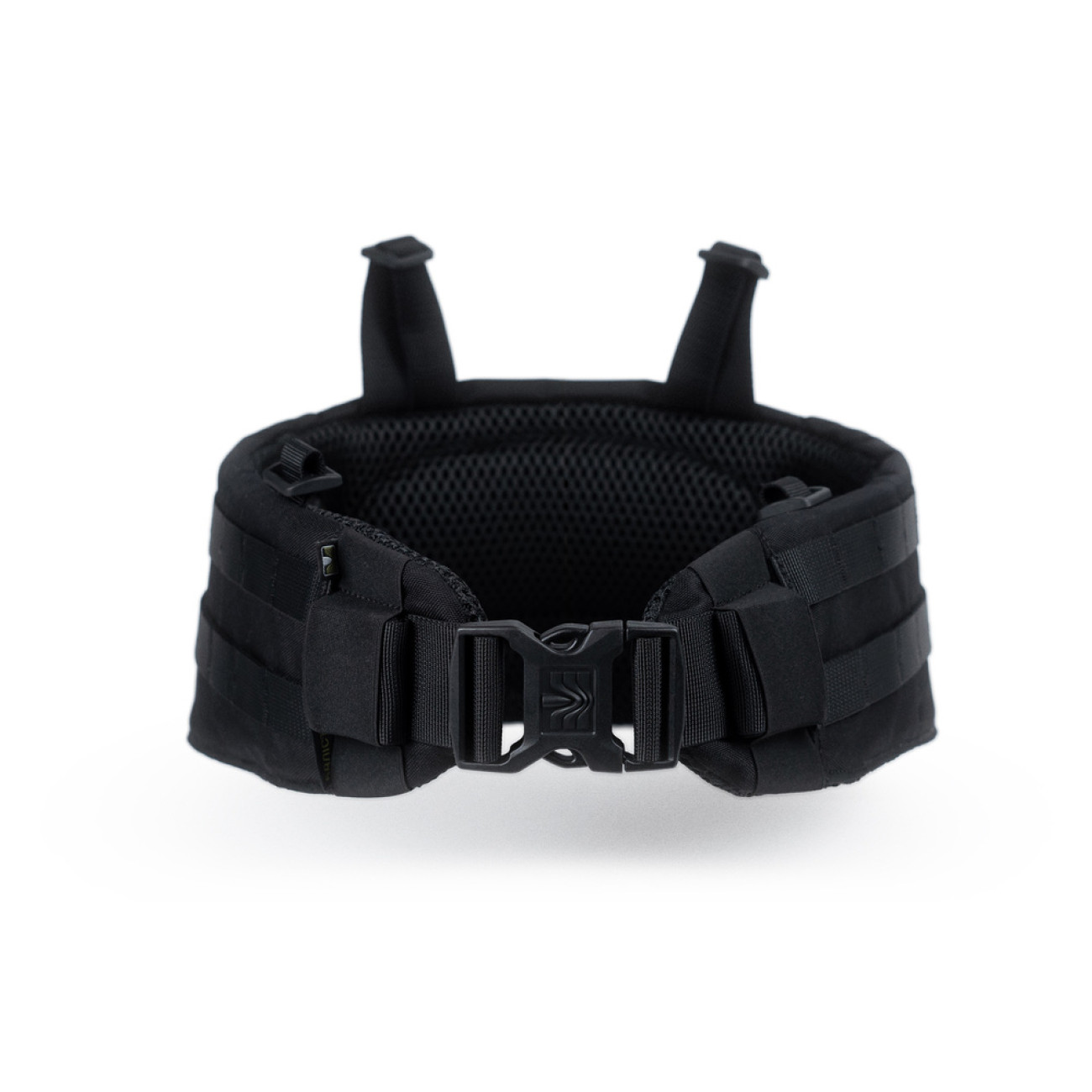 - Конструкция состоит из ремня с фастексом, который протянут сквозь основную платформу. Ремень значительно длиннее платформы, поэтому ее края даже не сходятся вместе. Благодаря этому промежутку боец может свободно наклоняться, приседать, занимать лежачее положение без ощущения скованности.