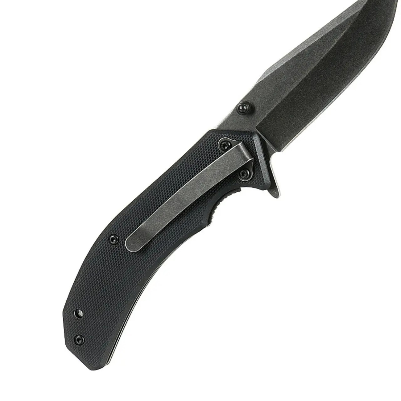 Клинок из хромовой нержавеющей стали 5Cr15MoV имеет популярную форму Clip Point с высокой проникающей способностью и отличными режущими свойствами. Черное покрытие защищает сталь от коррозии и придает тактический вид.