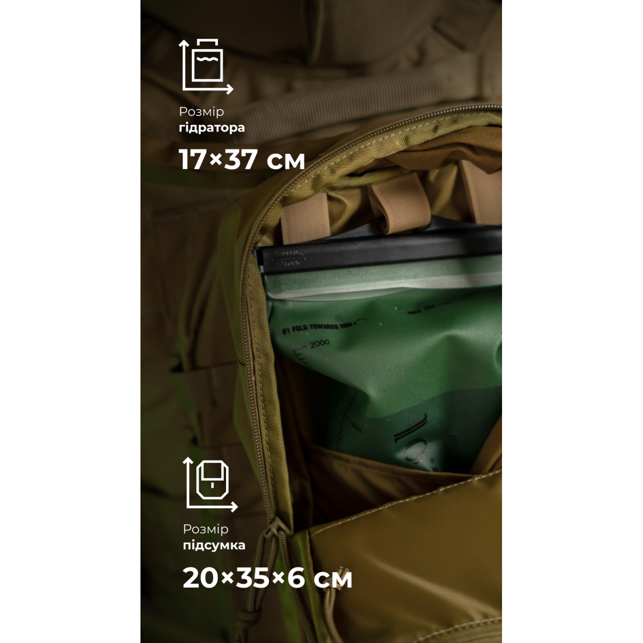 🔹 Подсумок оснащен открытым карманом 20×20 см. Объем подсумка немного больше размеров двухлитрового гидратора, что позволяет разместить рядом мелкое снаряжение.