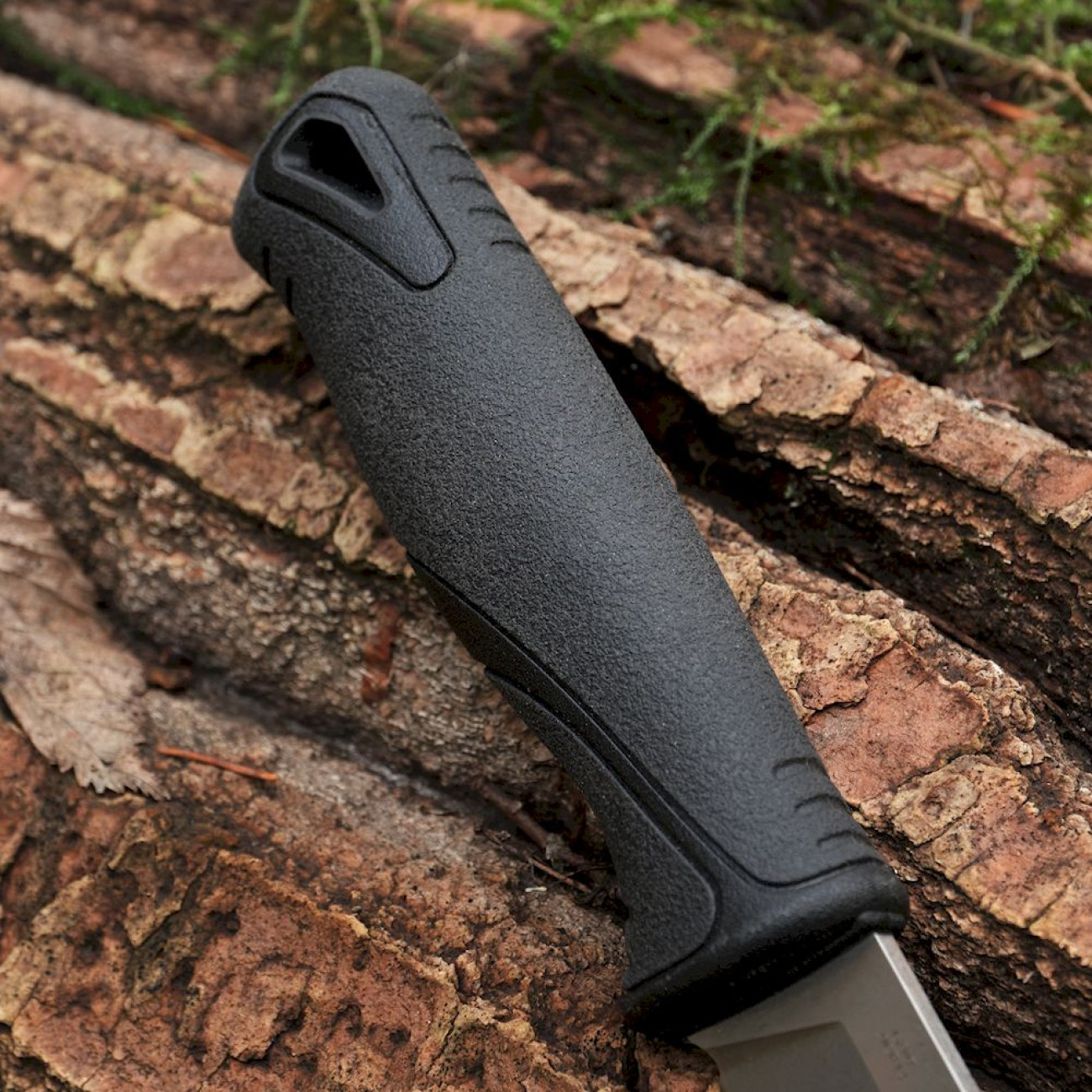 - Толщина обуха 3,3 мм обеспечивает устойчивость к высоким нагрузкам и предотвращает деформацию. Рукоятка длиной 11,5 см не имеет острых граней, что предотвращает натирание ладони. Материал рукоятки комбинированный: основа выполнена из полипропилена (PP) с покрытием из термопластичной резины (TPR). Благодаря такому сочетанию не боится механического воздействия и сохраняет целостность даже при сильном ударе. Рифленая поверхность снижает скольжение во влажной руке, а мелкие насечки ближе к клинку образуют упор под палец.