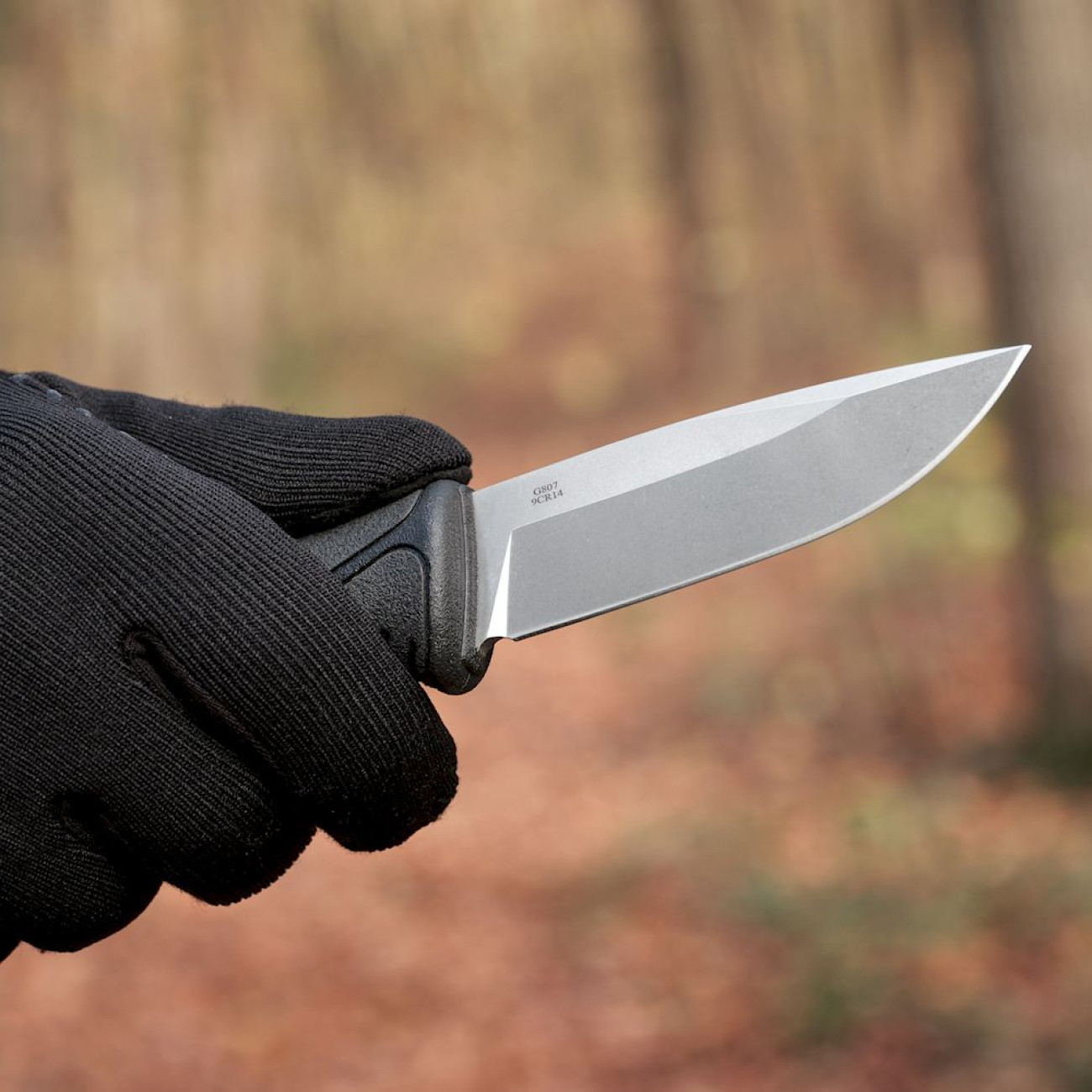 - Классический профиль клинка Drop Point эффективен при решении самых разных задач – от нарезки продуктов и заточки деревянных колышков до прокалывания тканей или пластиковых изделий.