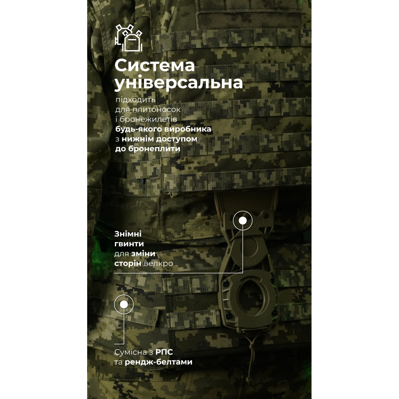 - Система универсальна, подходит для плитоносок и бронежилетов любого производителя с нижним доступом к бронеплите