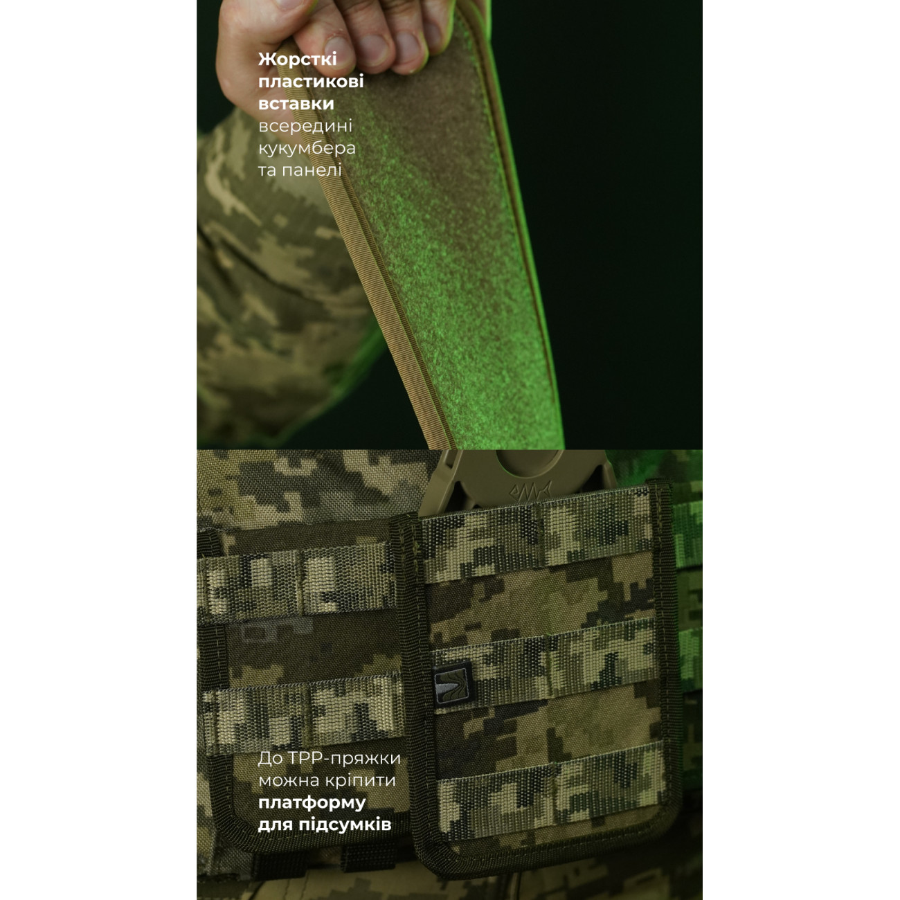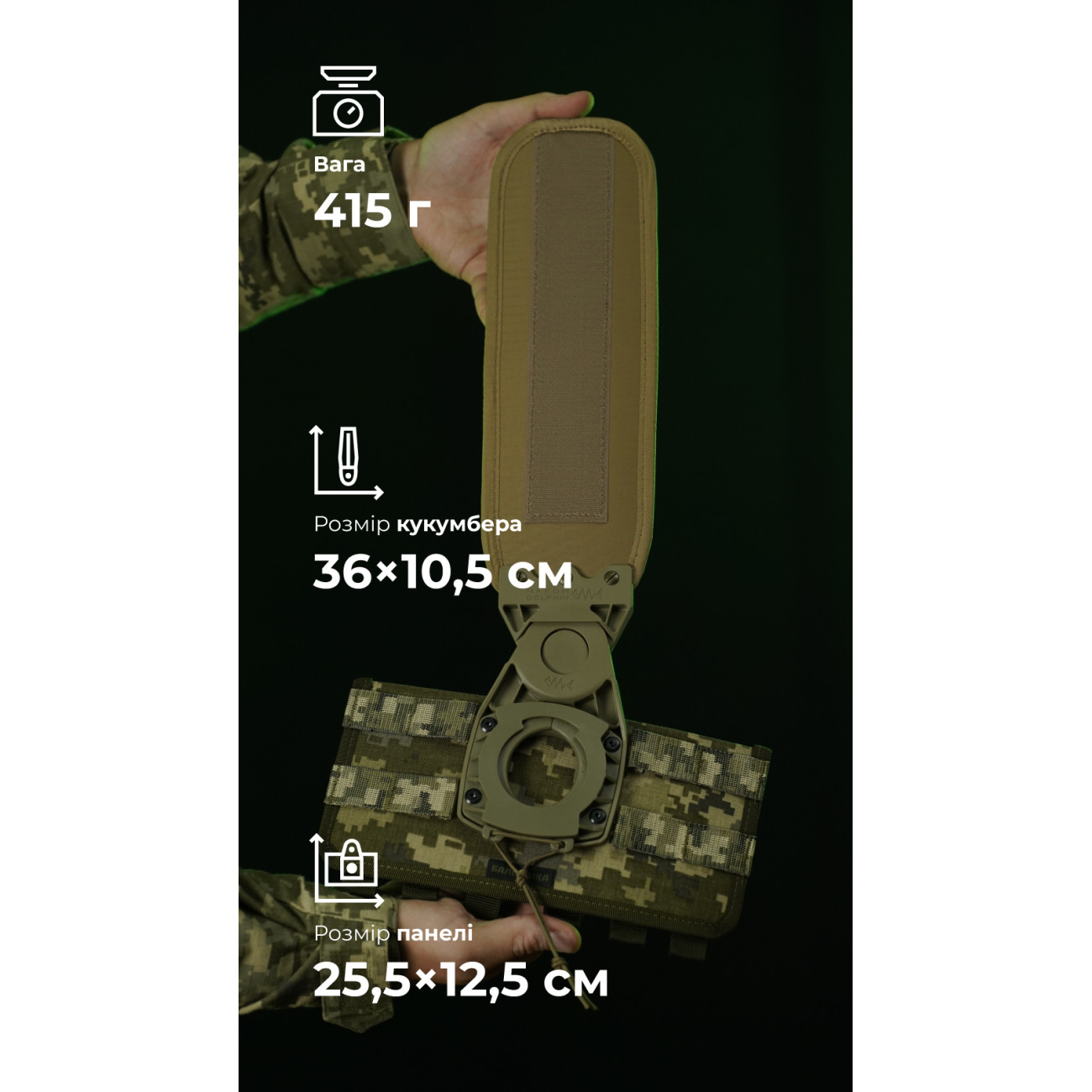 Кукумбер поднимает заднюю плиту бронежилета или плитоноски, а панель с TPP-пряжкой, пришнурованная к РПС, выступает как опора для кукумбера и берет на себя нагрузку.