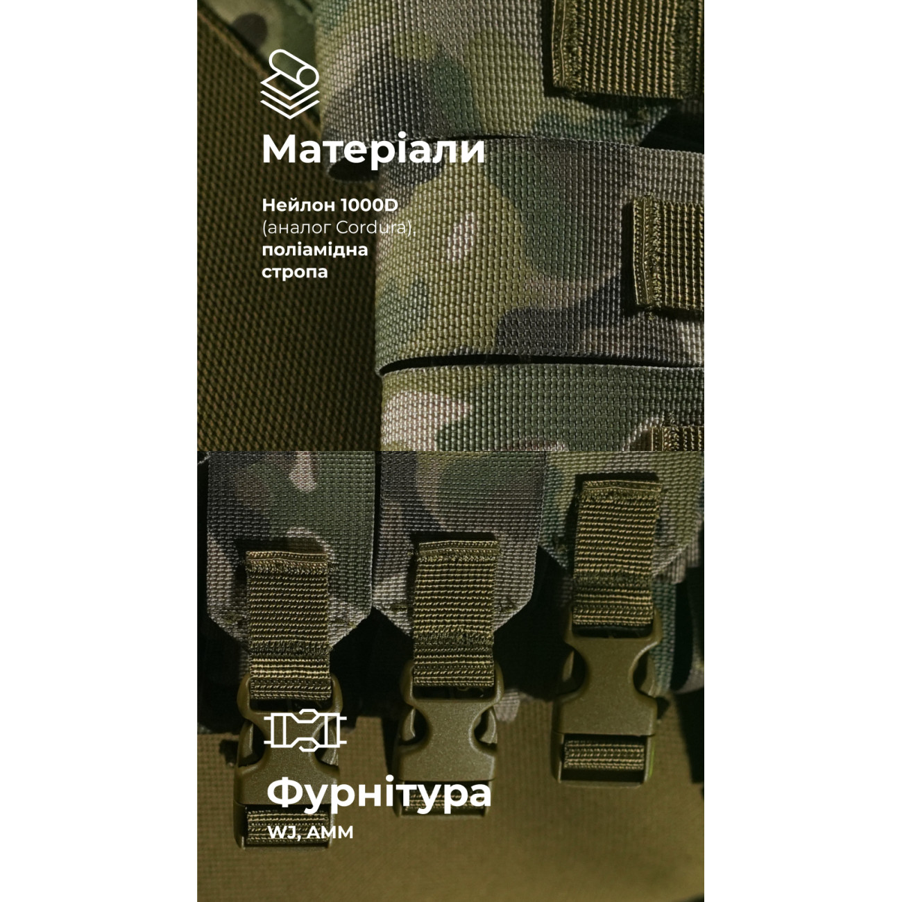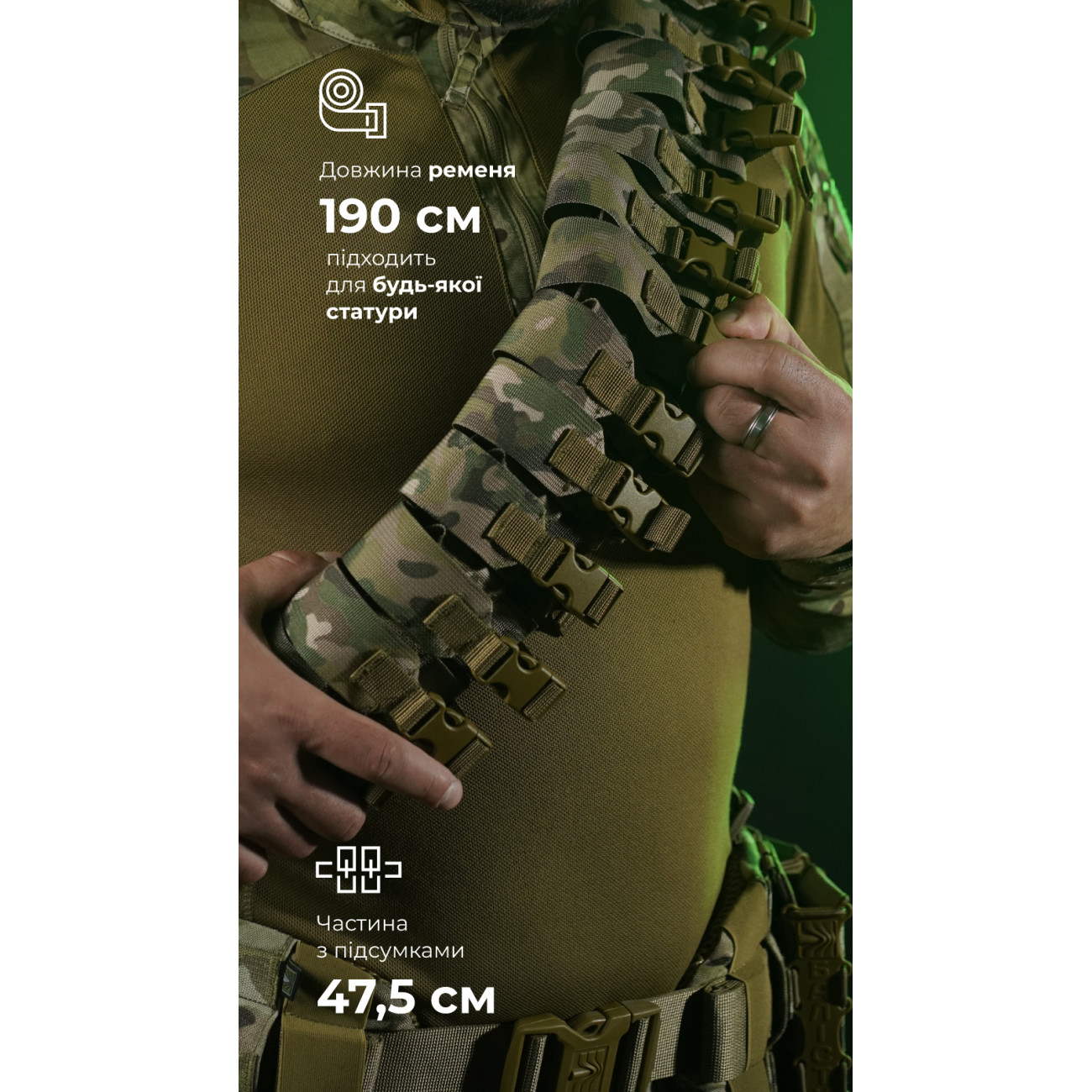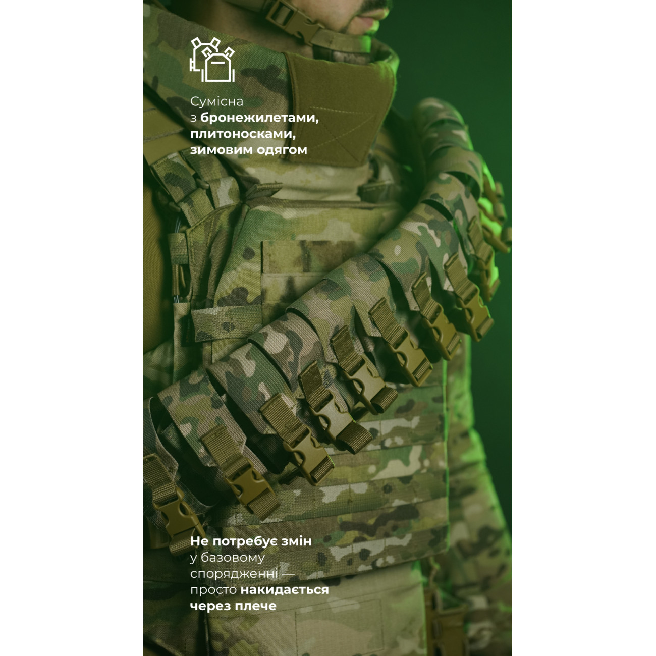 🔹 Благодаря достаточной длине бандольера подходит для бойцов с крупным телосложением, под большие бронежилеты и объемные зимние куртки.