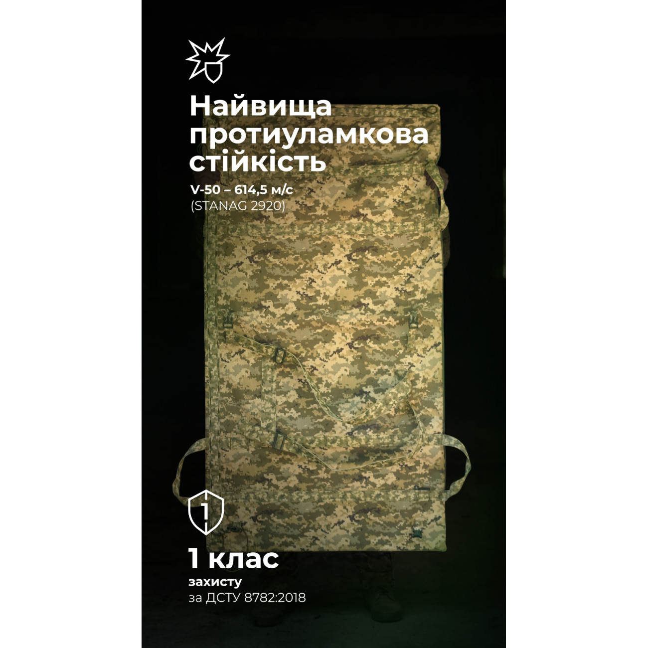- Соответствует 1-му классу защиты по ДСТУ 8782:2018 STANAG 2920 V-50 – 614,5 м/с