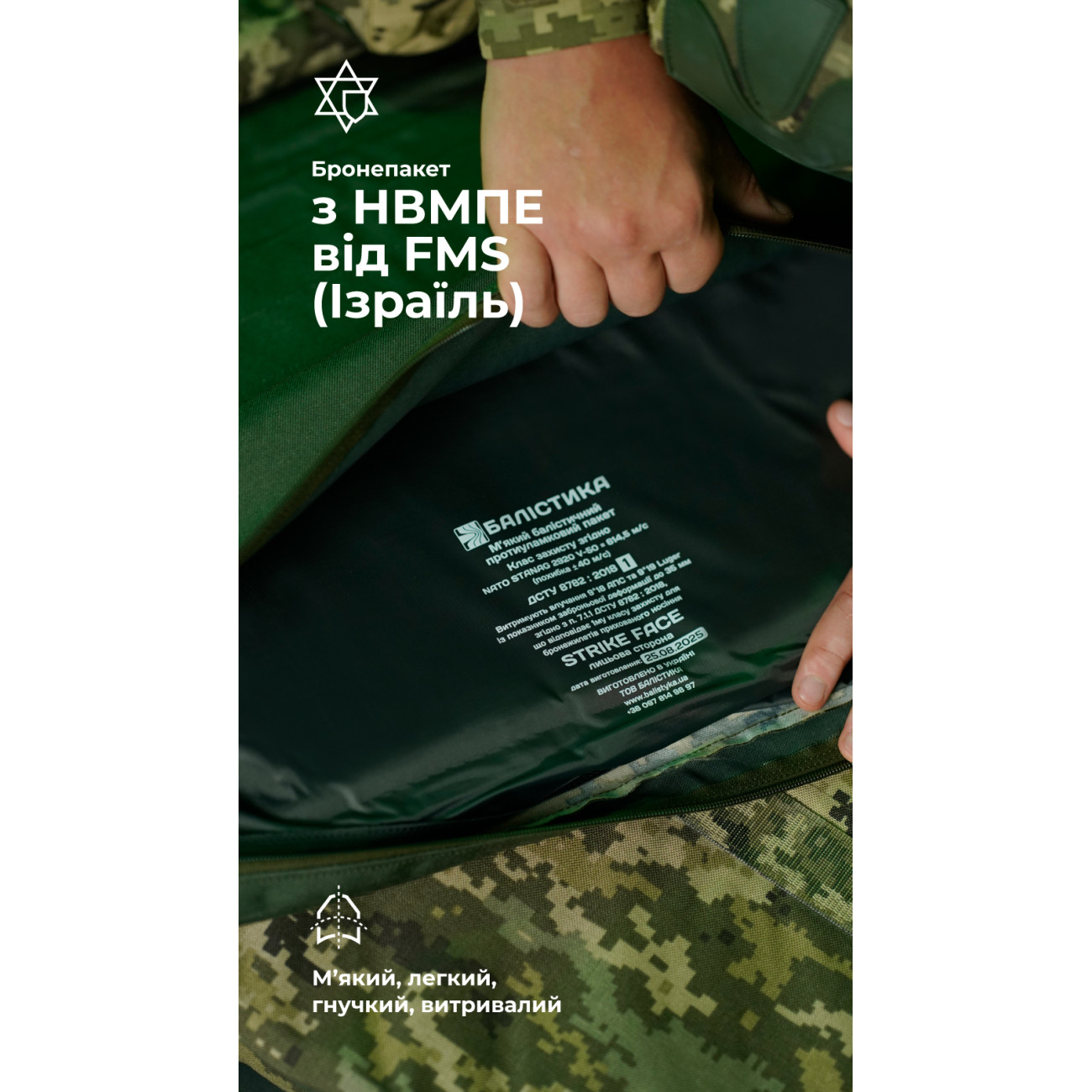 🔹 Баллистический пакет изготовлен из СВМПЭ от FMS (Израиль). Соответствует 1-му классу ДСТУ 8782:2018, имеет показатель NATO STANAG 2920 V-50 – 614,5 м/с.