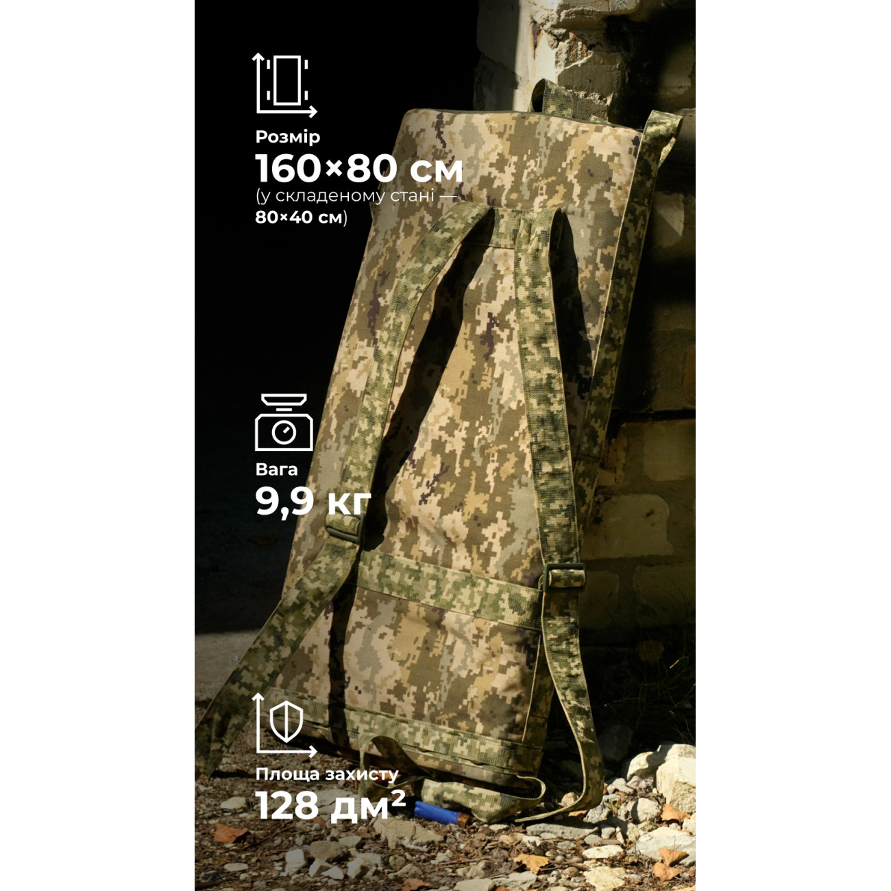 🔹 С помощью широких крепких лямок (85×5 см) из сдвоенной стропы сложенную броню можно переносить как рюкзак. Двухщелевые пряжки позволяют регулировать их длину.