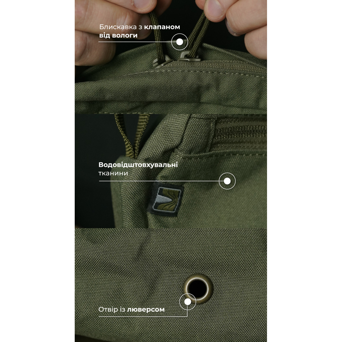 - Защита от влаги: клапан на молнии + влагоотталкивающая пропитка + дренажное отверстие