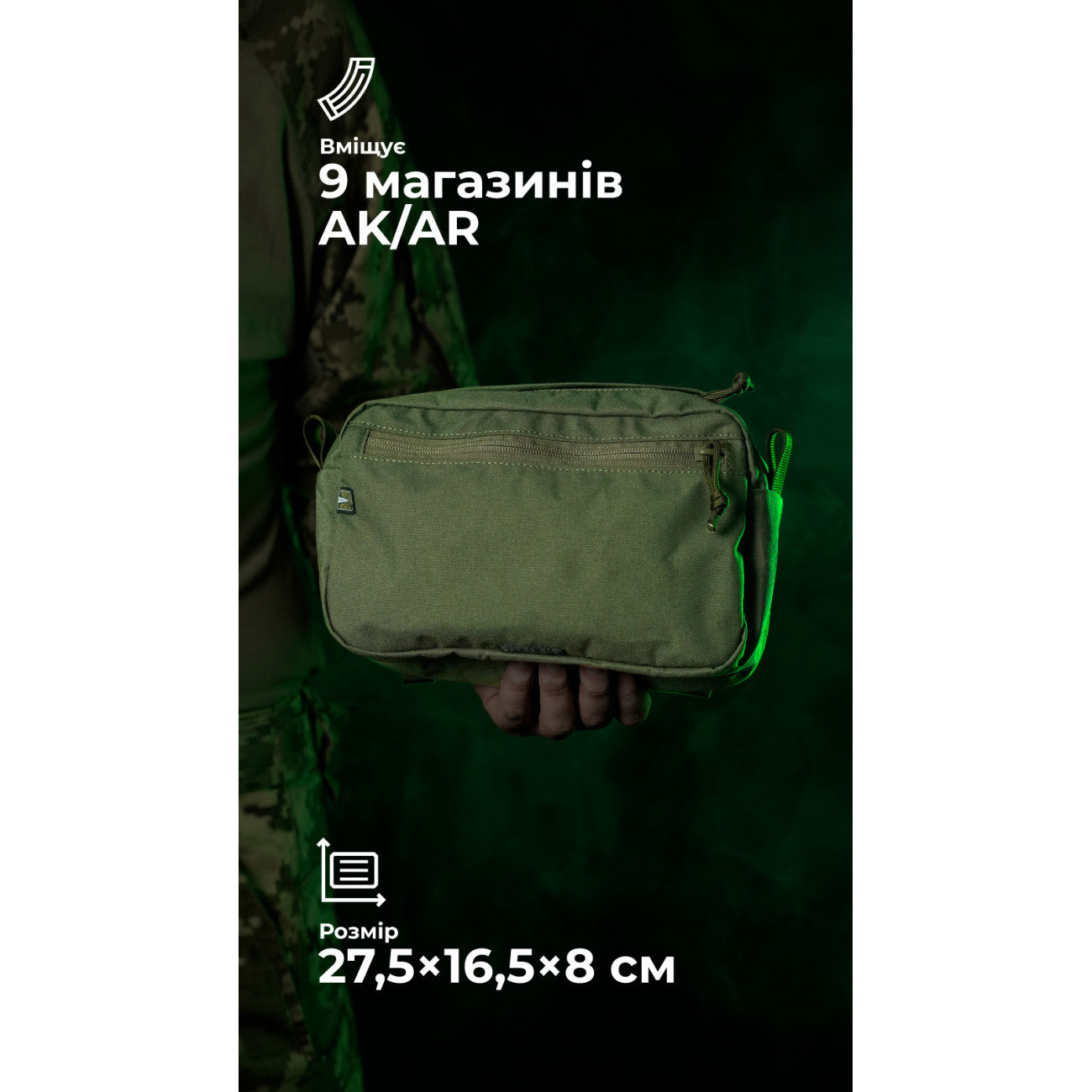 Подсумок объемом 4 л легко вместит 9 магазинов на 30 патронов AK/AR или боекомплект россыпью. Также в нем можно хранить перчатки, блокнот, карту или сухпай.