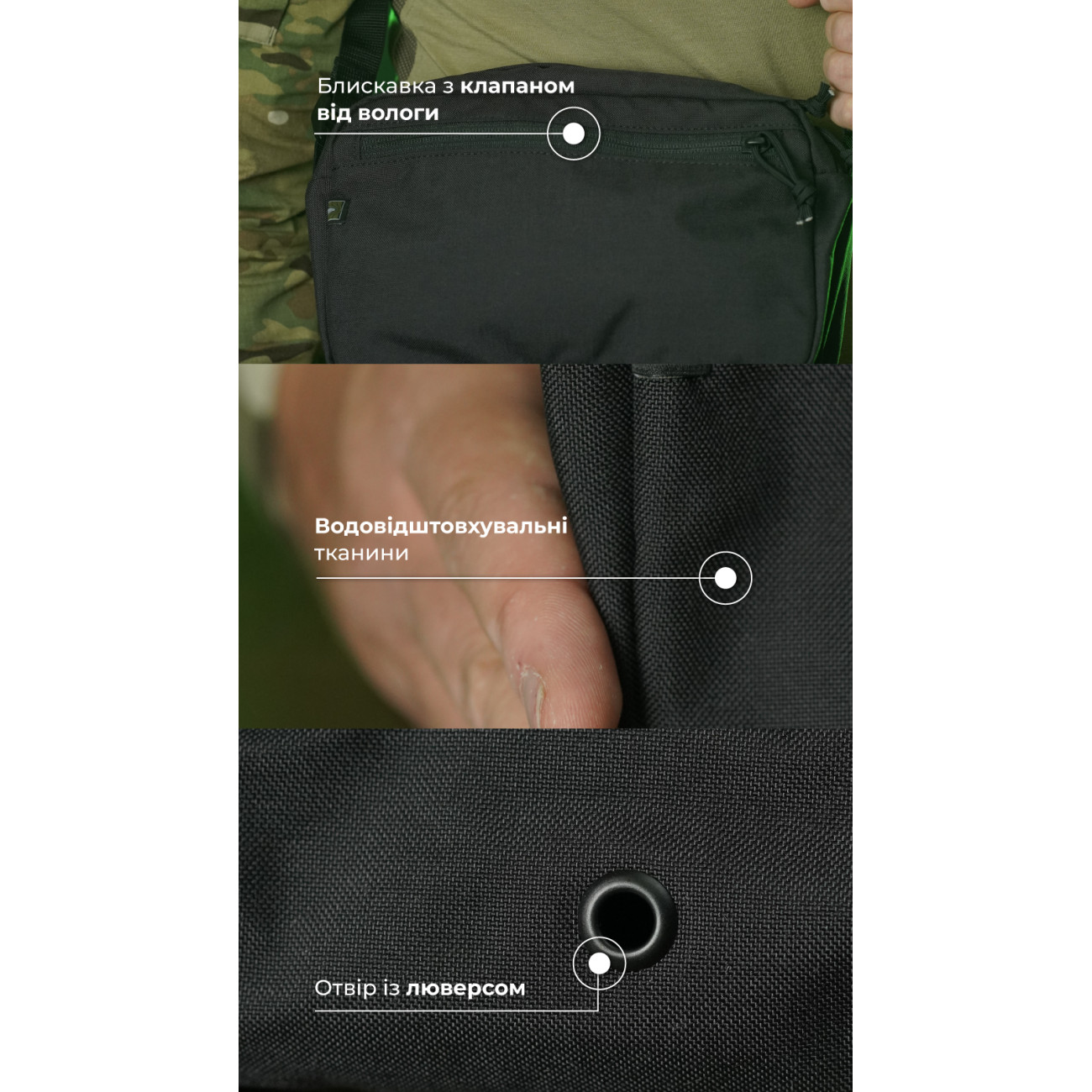 - Защита от влаги: клапан на молнии + влагоотталкивающая пропитка + дренажное отверстие