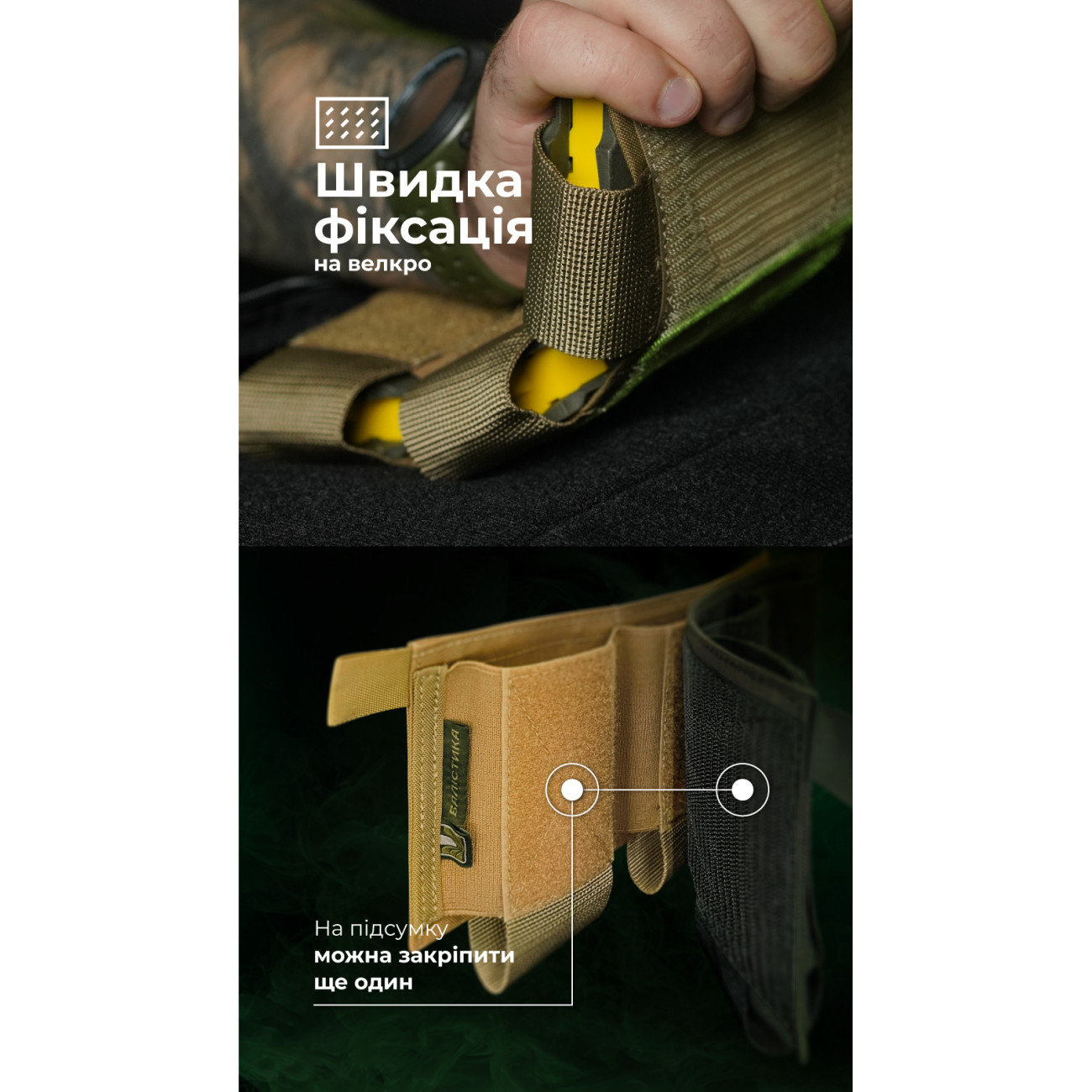 🔹 Впереди на каждом отсеке помещена велкро-панель (5×10 см). На них можно закрепить еще один такой подсумок под магазины.