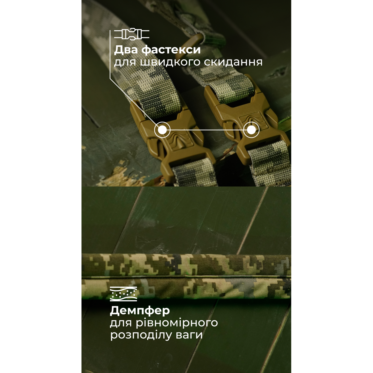 🔹 На обоих концах ремня установлены фастексы для быстрого сброса или смены местами фиксационных строп.