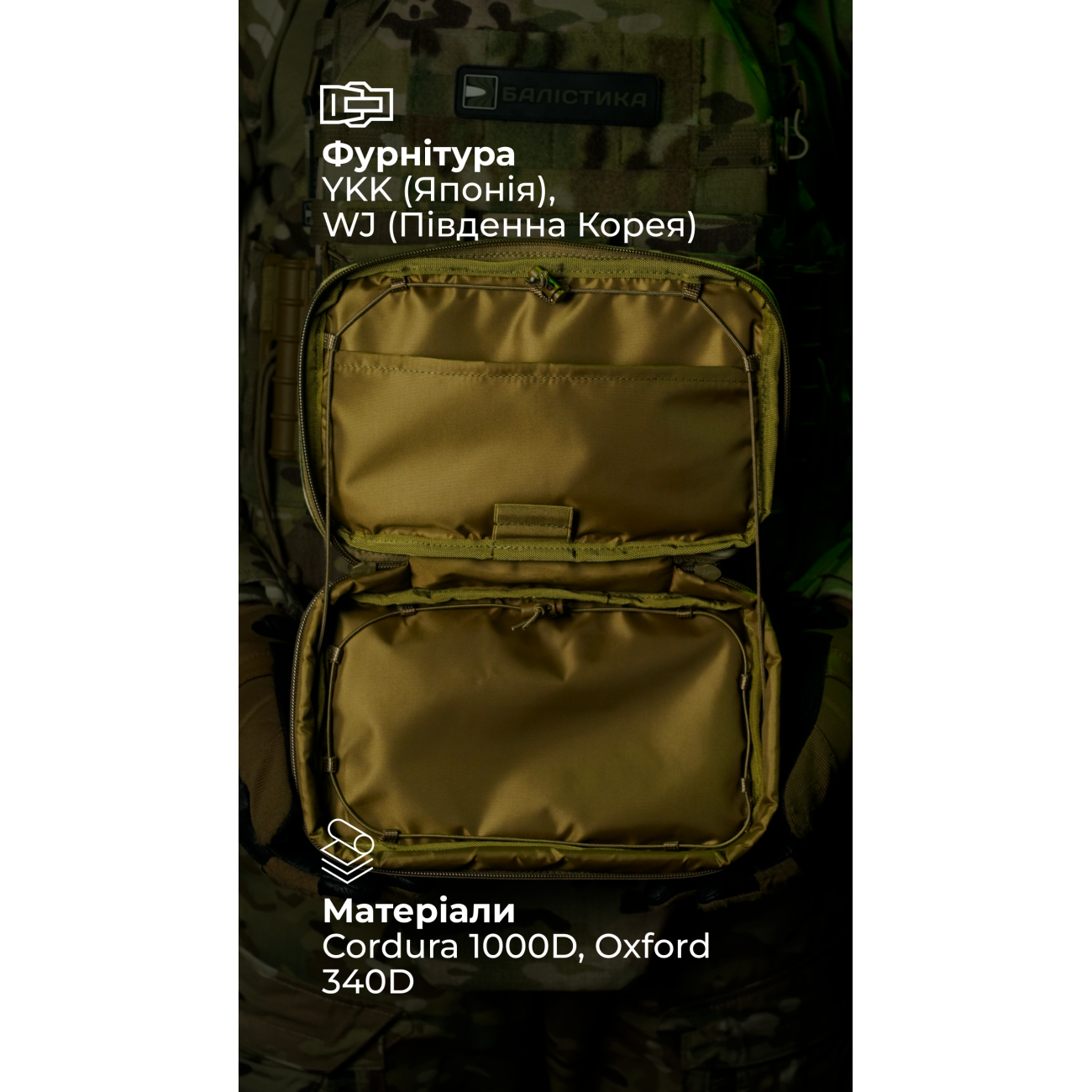 🔹 Спереди предусмотрена фирменная косая велкро-панель (~27×8 см), на которую можно крепить патчи и идентификаторы.