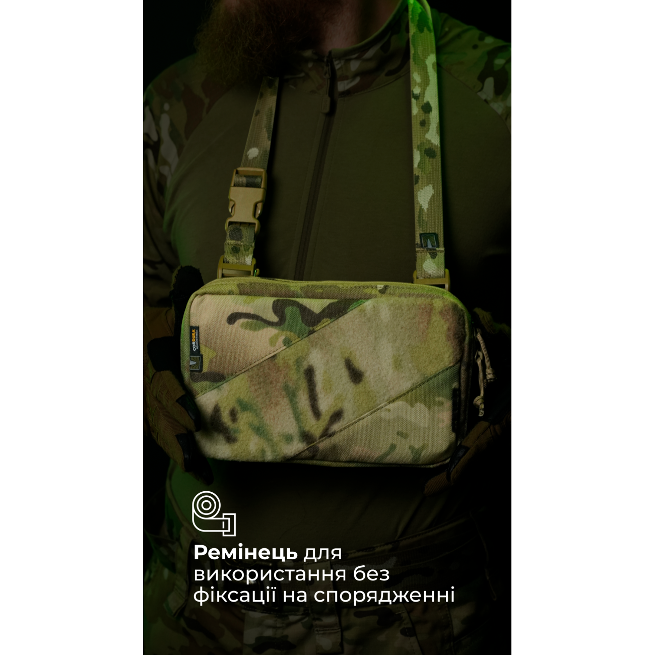 ✔️ Ремешок поставляется вместе с подсумком и крепится карабинами к крайним верхним ячейкам молли или вертикальным стропам.