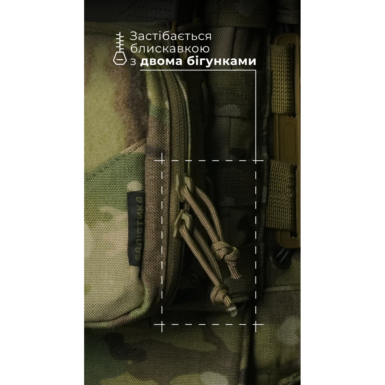🔹 Подсумок шнуруется к плитоноске четырьмя стропами и занимает ширину шести ячеек молли. Оптимально закрепить его сверху на трех «Колчанах».