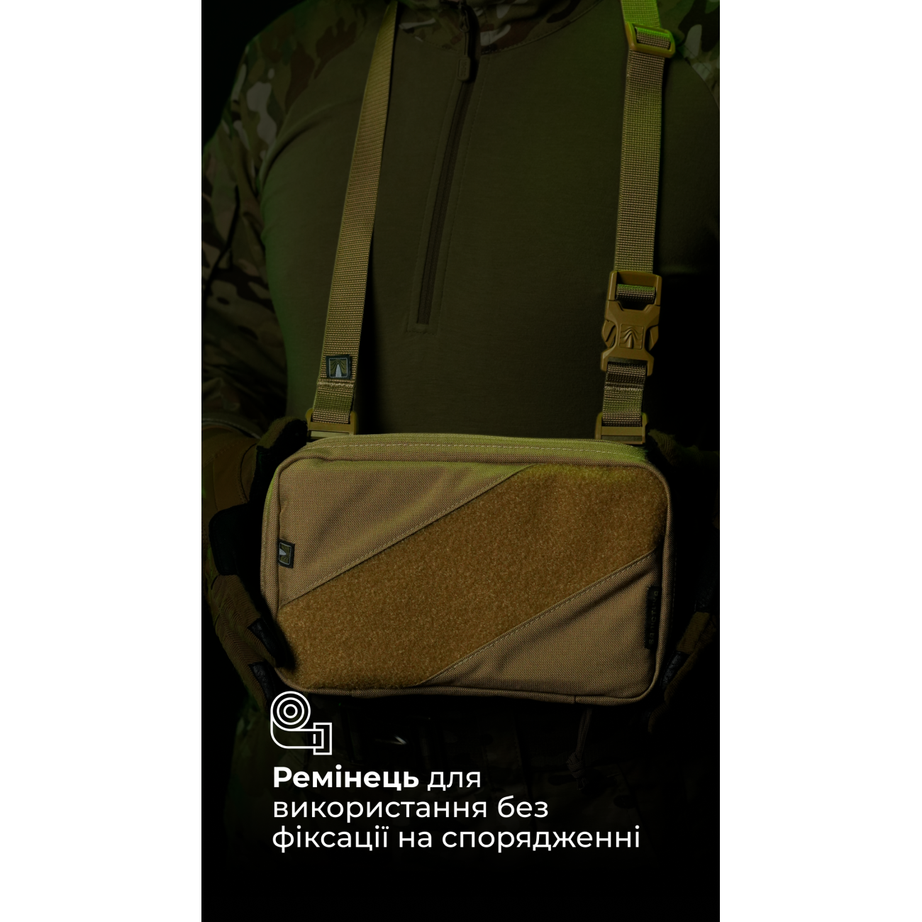 ✔️ Ремешок поставляется вместе с подсумком и крепится карабинами к крайним верхним ячейкам молли или вертикальным стропам.