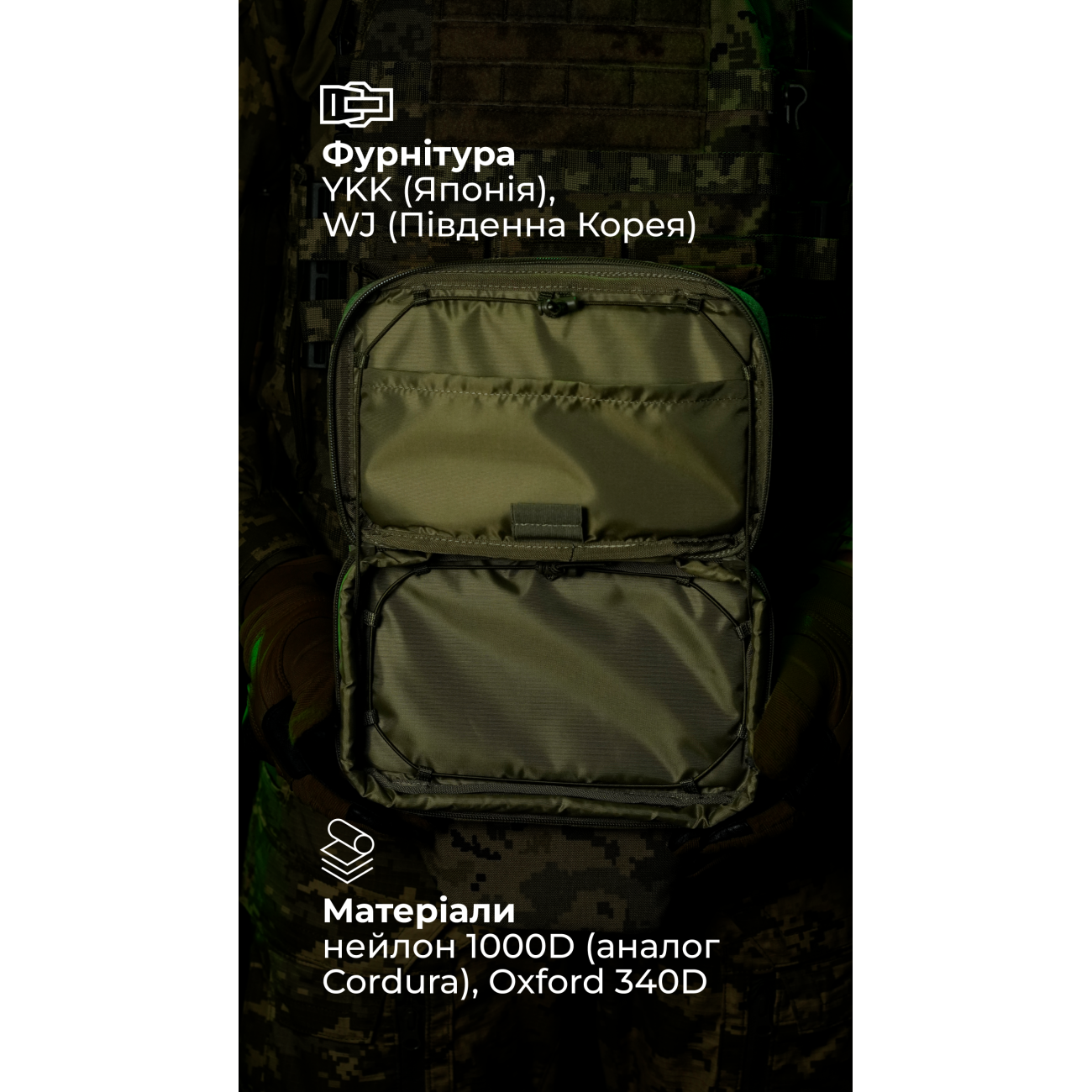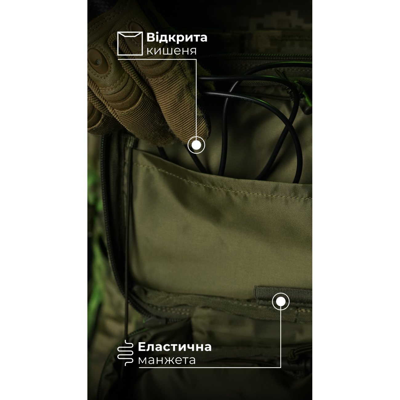 🔹 Спереди предусмотрена фирменная косая велкро-панель (~27×8 см), на которую можно крепить патчи и идентификаторы.