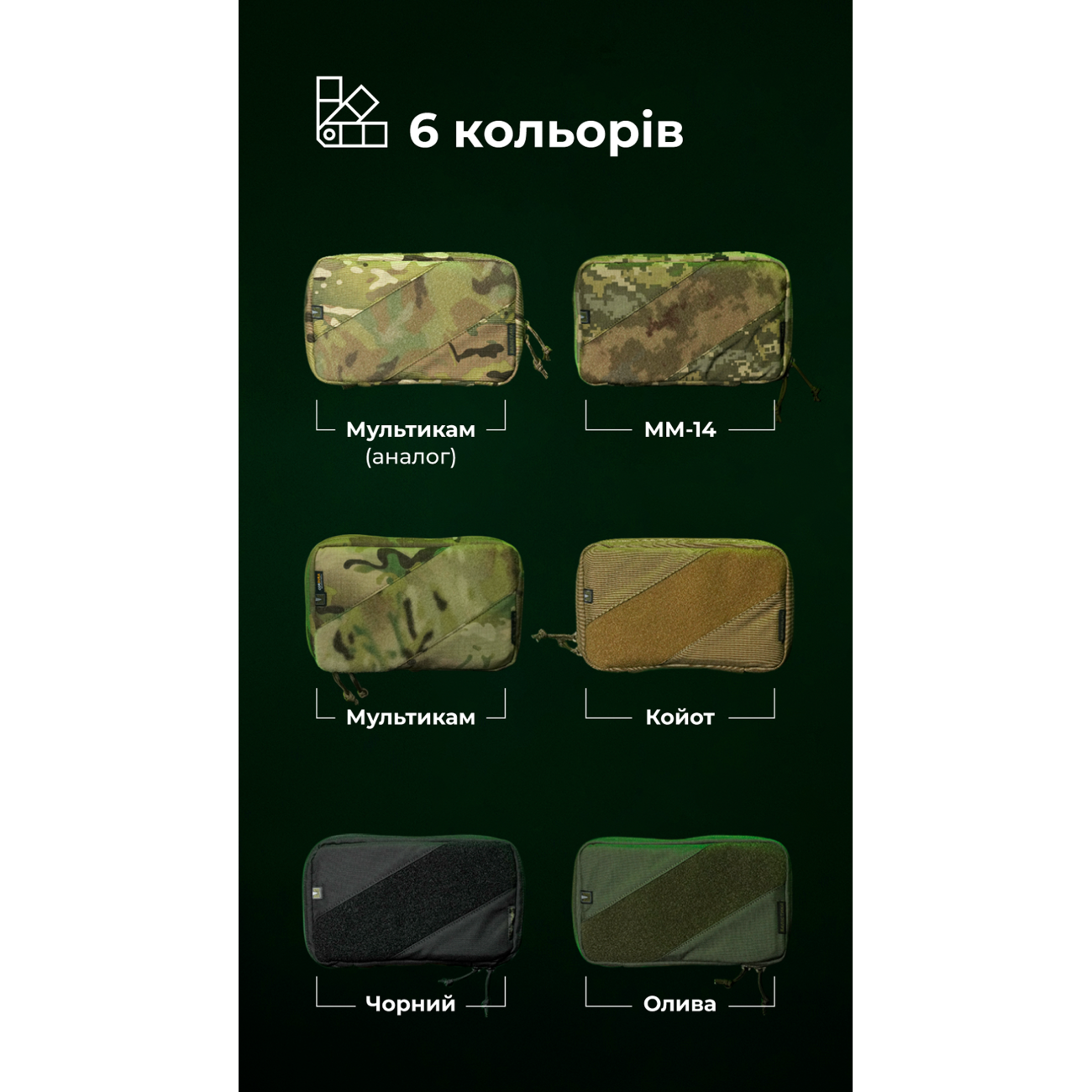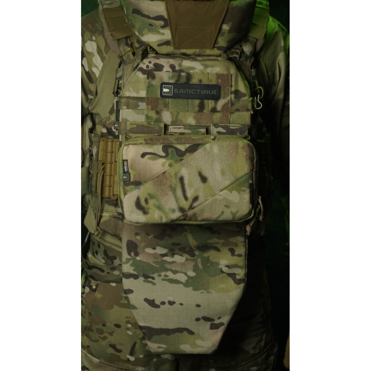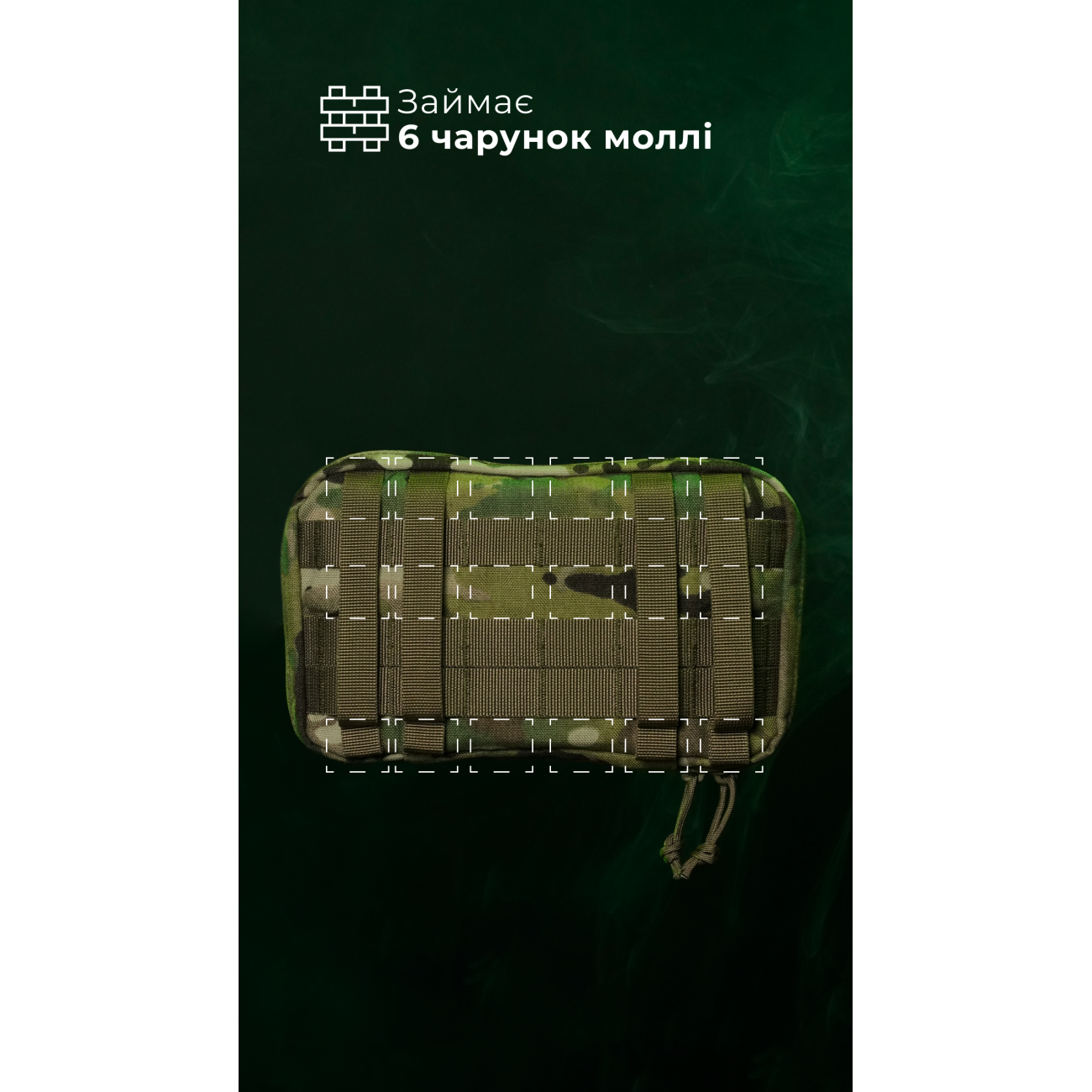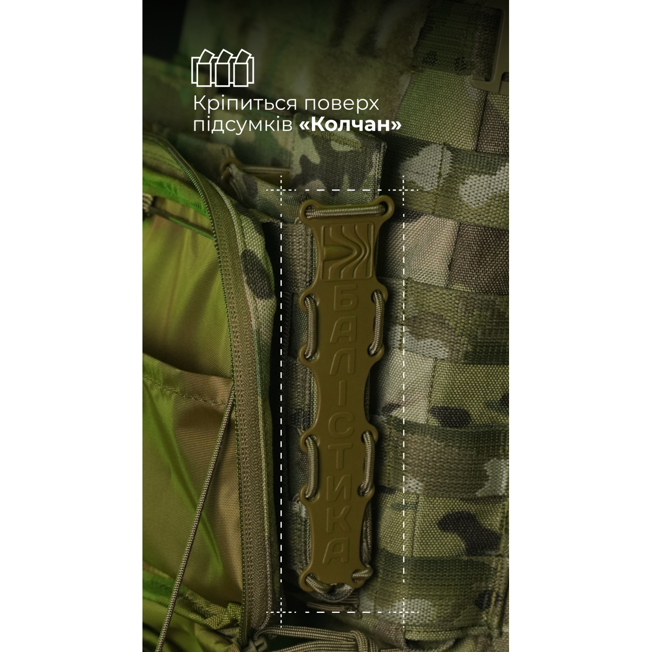🔹 Подсумок шнуруется к плитоноске четырьмя стропами и занимает ширину шести ячеек молли. Оптимально закрепить его сверху на трех подсумках «Колчан».
