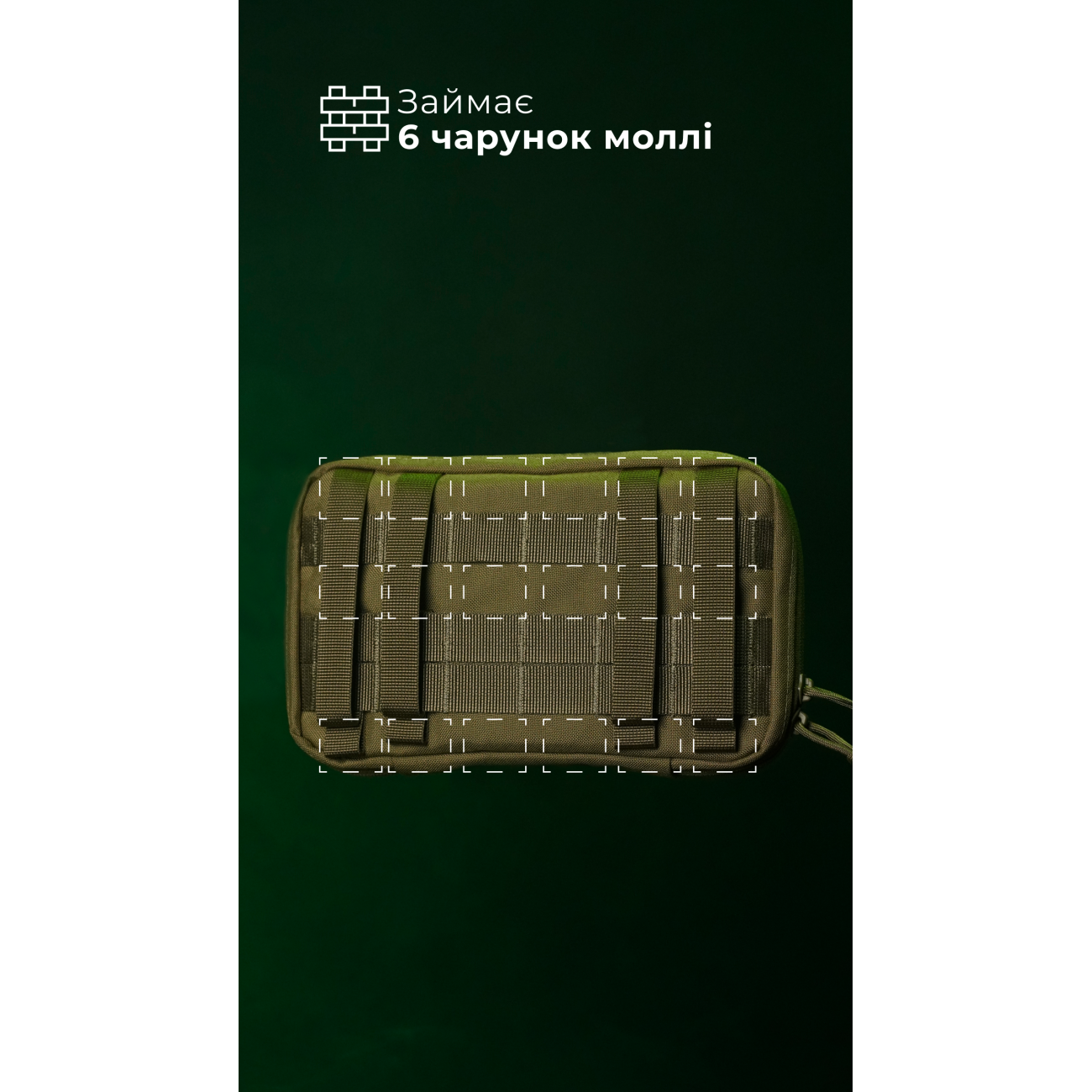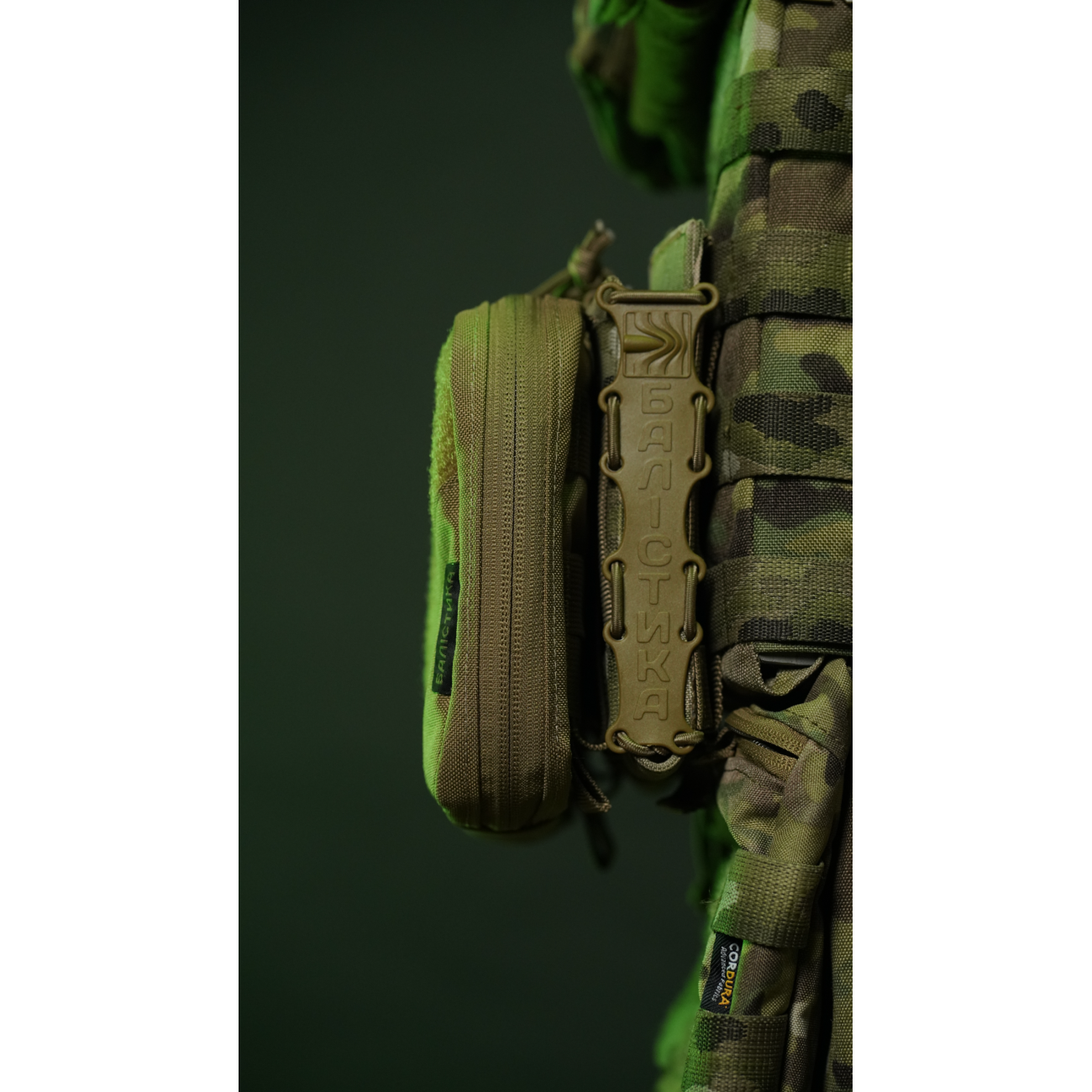 🔹 Подсумок шнуруется к плитоноске четырьмя стропами и занимает ширину шести ячеек молли. Оптимально закрепить его сверху на трех подсумках «Колчан».