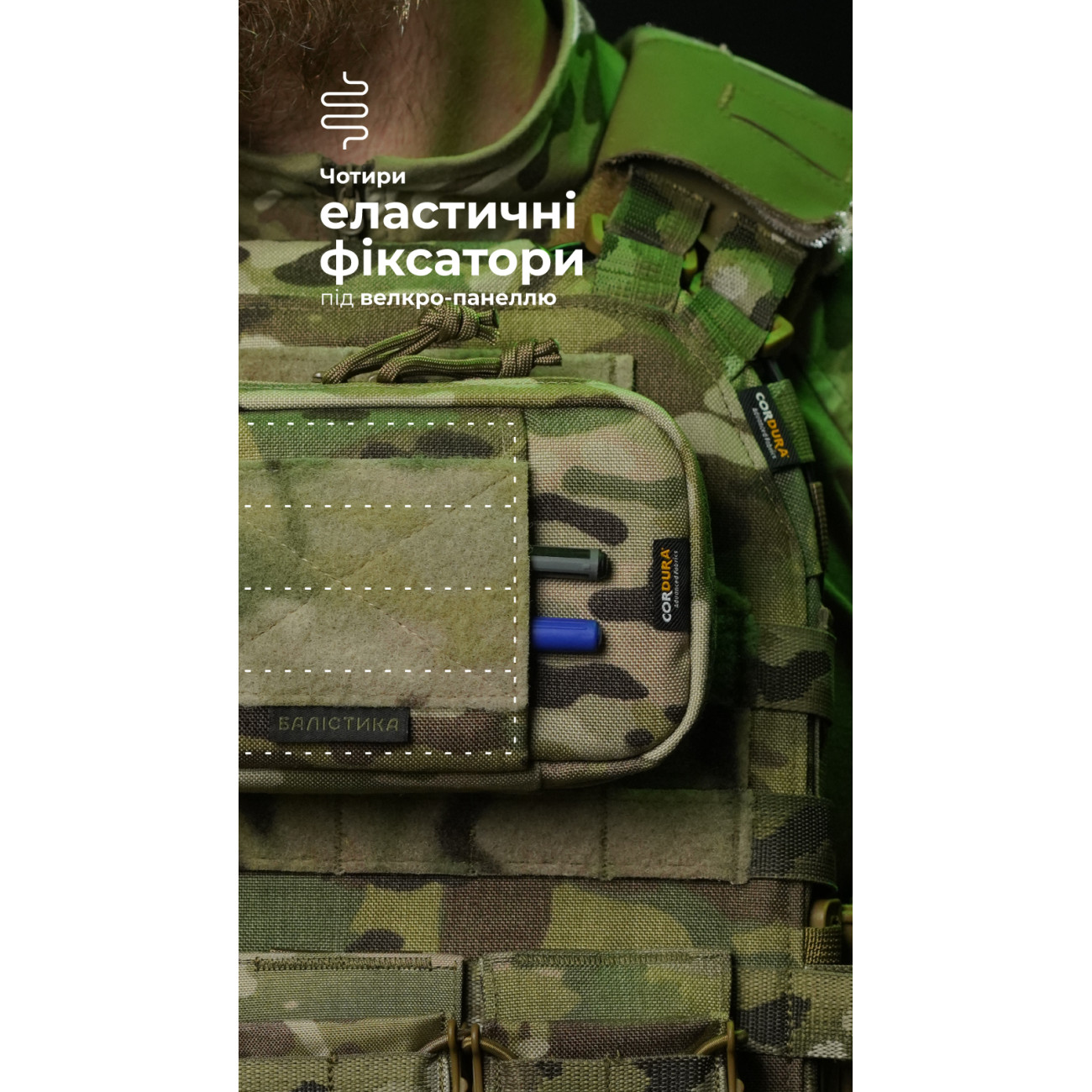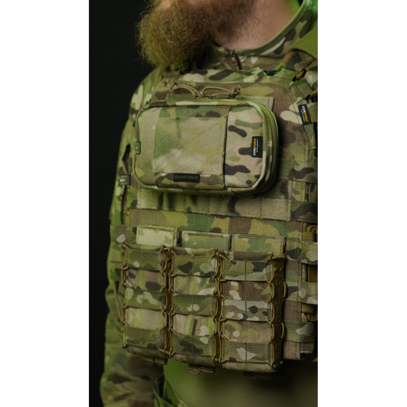 - Не конфликтует с магазинами в «Колчанах», когда размещен на верхней передней панели плитоноски / бронежилета
